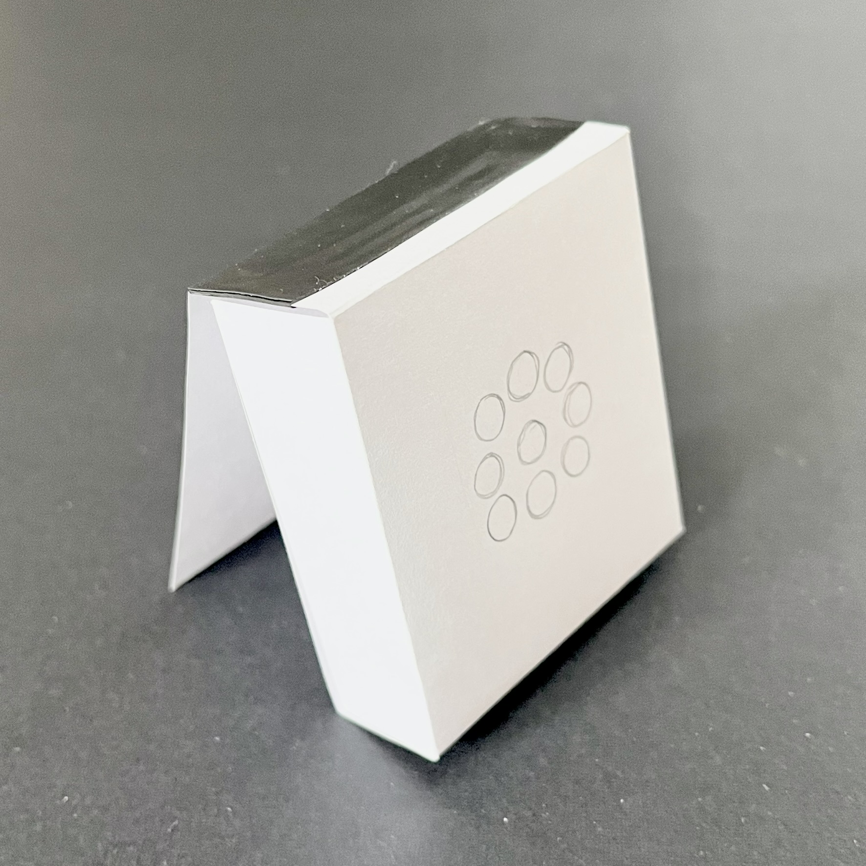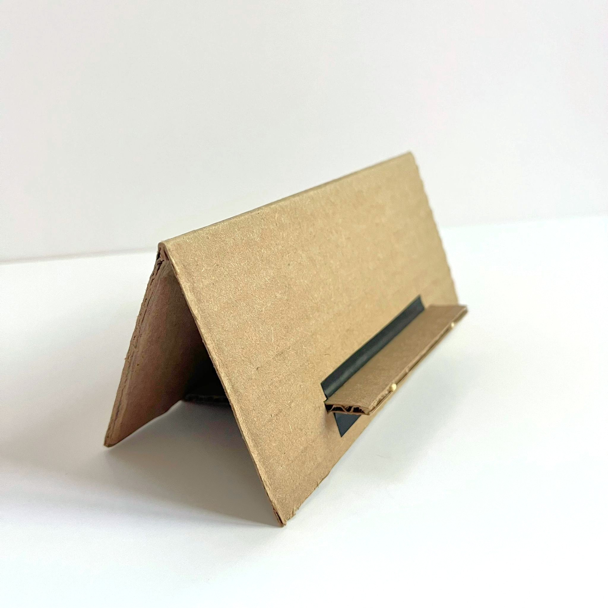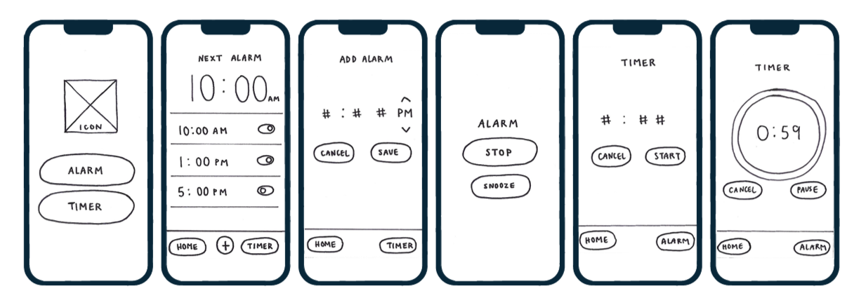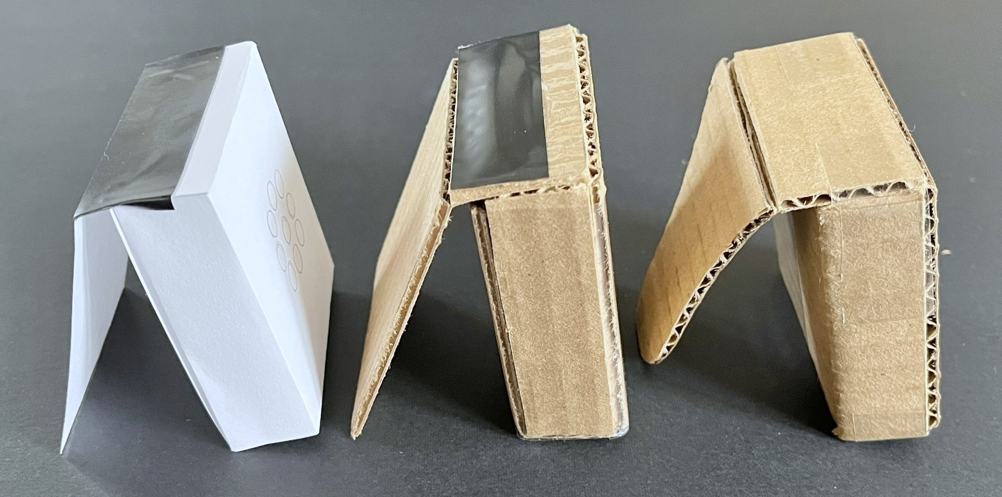 The evolution of the physical prototypes is shown, from paper to cardboard and a slightly refined cardboard version. All prototypes can latch onto clothing and stand independently. In addition, paper screens were created to represent the app/digital interaction for the alarm/timer functions.