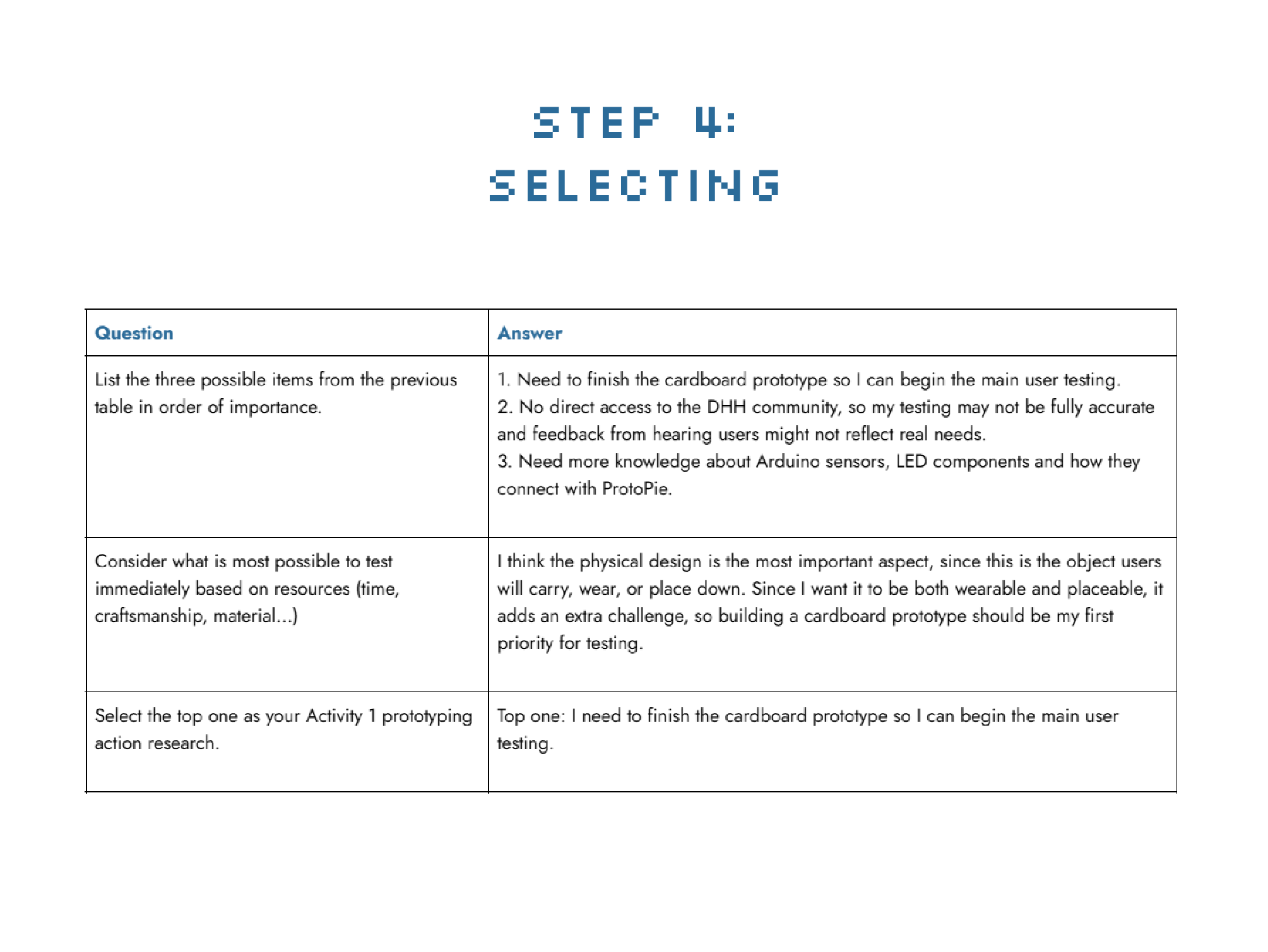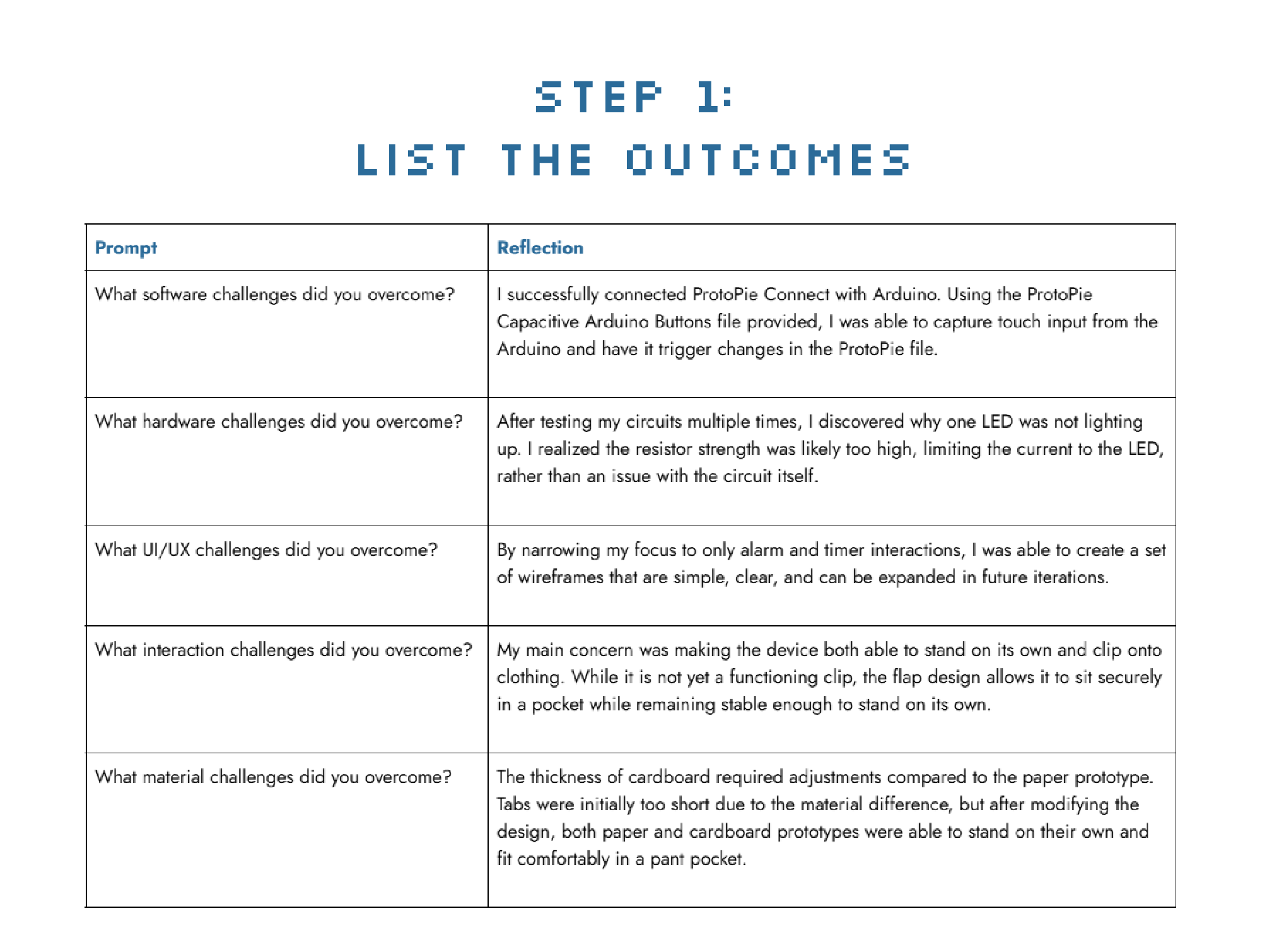 Project 2 Module focuses on introducing physical prototypes and UX prototyping testing methods. Through weekly activities, I was able to gradually make progress toward the functional design of the final project by developing UI screens, paper and cardboard prototypes and circuit components, all supported by additional research to strengthen the concepts and inform design decisions.