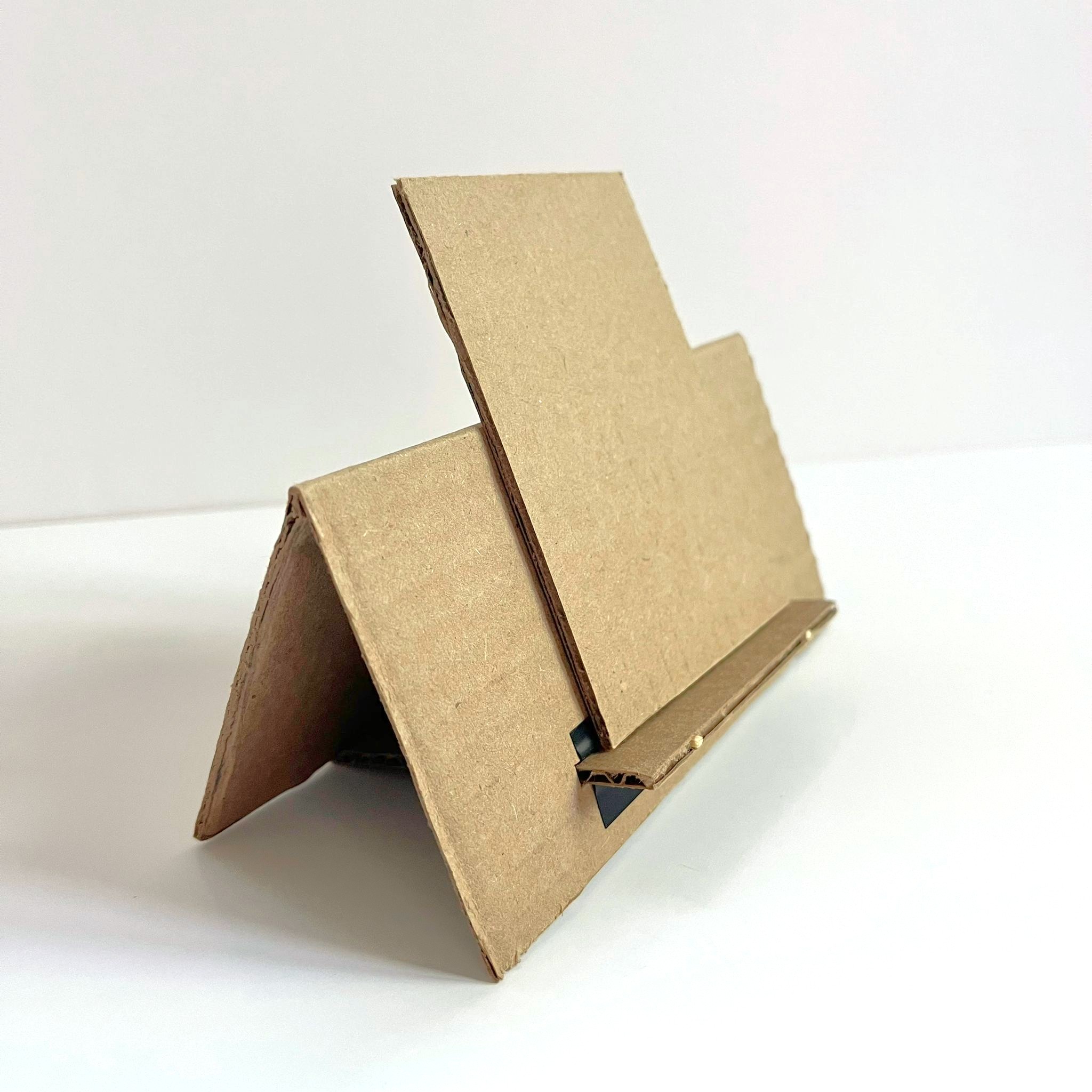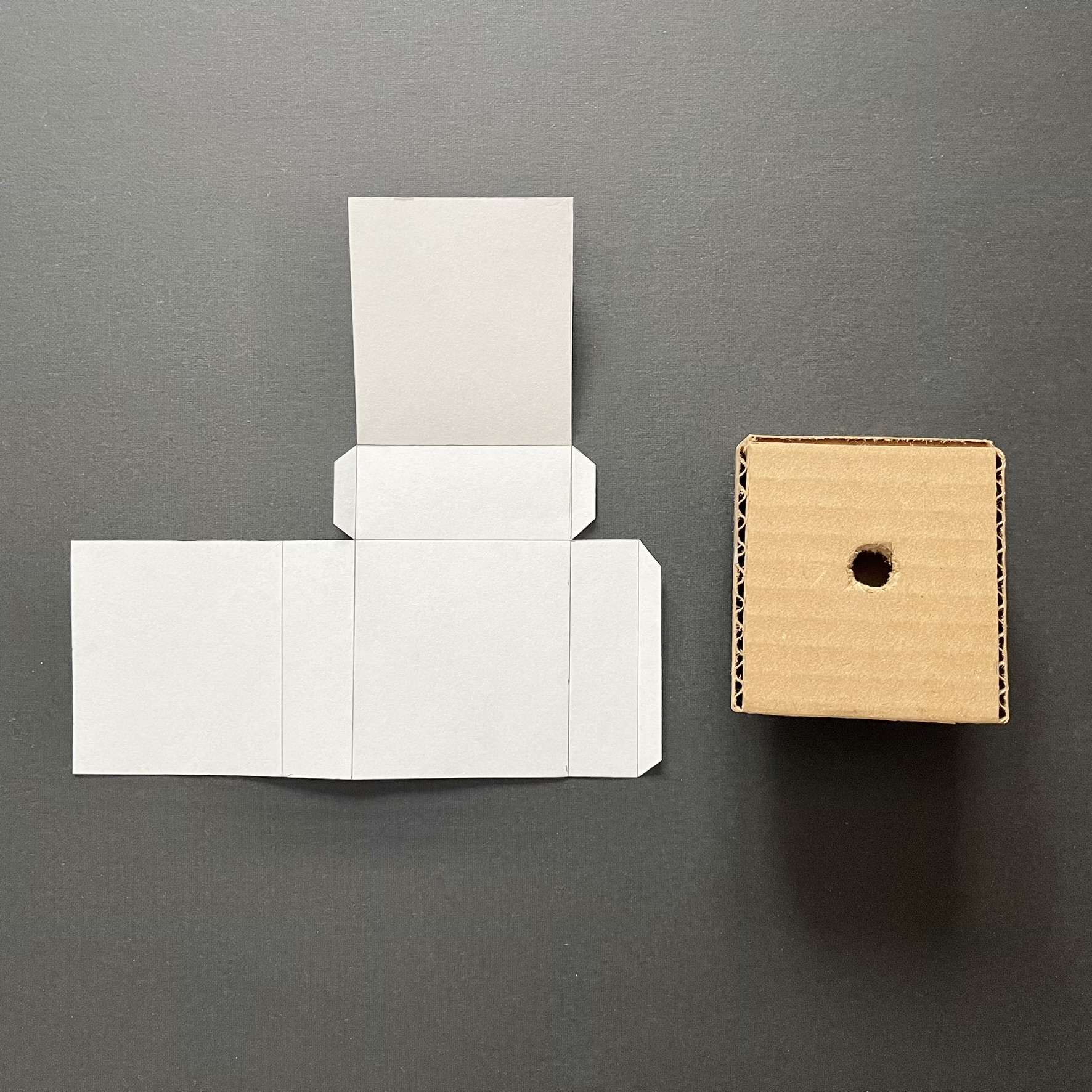 The evolution of the physical prototypes is shown, from paper to cardboard and a slightly refined cardboard version. All prototypes can latch onto clothing and stand independently. In addition, paper screens were created to represent the app/digital interaction for the alarm/timer functions.